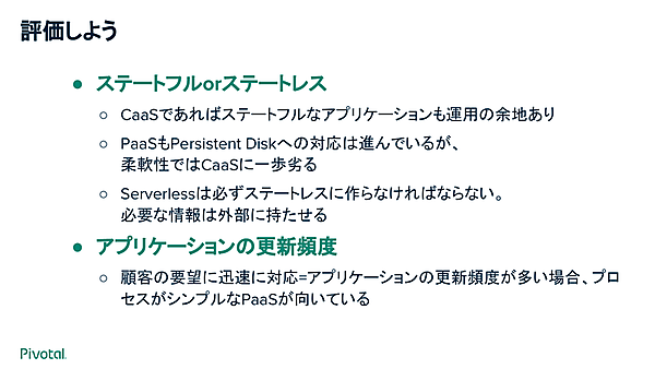 4点目は「ステートフルかステートレス」か。データベースのようなステートフルなアプリケーションを動かすならCaaSを選ぶことになる。5点目は「アプリケーションの更新頻度」で、更新頻度が高い場合はPaaSが向いているという。