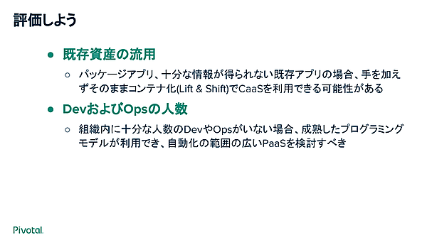 6点目は「既存資産を流用するか」。そのままLift & Shiftで動かすにはCaaSが良いかもしれない。7点目は「開発者と運用者の人数」で、十分な開発者・運用者を確保できないならPaaSが良いかもしれない、という。