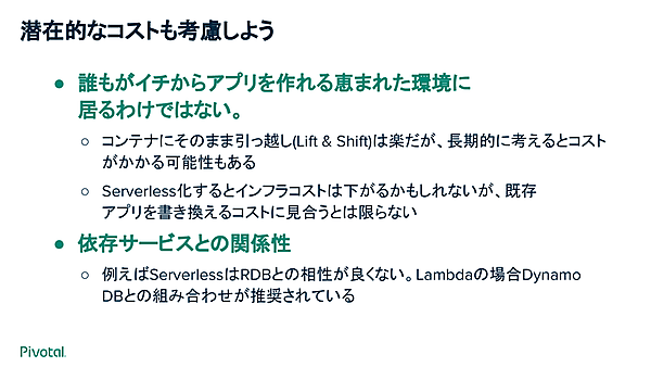1点目は「誰もが一からアプリケーションを作れる恵まれた環境にいるわけではない」ということ。例えば、CaaSにLift & Shiftするだけなら楽な一方、長期的にはコストがかかるという可能性もある。また、Serverless化するとインフラコストは下がる一方、アプリを書き換えるコストがかかる可能性もある。