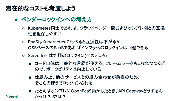 1点目は「強靭性・回復性」、2点目は「スケーラビリティ」だ。例えば、キャンペーンサイトはServerlessのメリットが生きる(ただしコスト高になる可能性もある)という。3点目は「パフォーマンス」で、例えばServerlessのコールドスタート問題を許容できるかどうかで判断が変わるという。評価ポイント:強靭性、スケーラビリティ、パフォーマンス4点目は「ステートフルかステートレス」か。データベースのようなステートフルなアプリケーションを動かすならCaaSを選ぶことになる。5点目は「アプリケーションの更新頻度」で、更新頻度が高い場合はPaaSが向いているという。評価ポイント:ステートフルかステートレスか、更新頻度6点目は「既存資産を流用するか」。そのままLift & Shiftで動かすにはCaaSが良いかもしれない。7点目は「開発者と運用者の人数」で、十分な開発者・運用者を確保できないならPaaSが良いかもしれない、という。評価ポイント:既存資産、開発者と運用者の人数こうした機能要件のほか、草間氏は潜在的なコスト面についても指摘する。 1点目は「誰もが一からアプリケーションを作れる恵まれた環境にいるわけではない」ということ。例えば、CaaSにLift & Shiftするだけなら楽な一方、長期的にはコストがかかるという可能性もある。また、Serverless化するとインフラコストは下がる一方、アプリを書き換えるコストがかかる可能性もある。 2点目は「依存サービスとの関係」だ。ServerlessはRDBMSとの組み合わせにはあまり向かず、同じプラットフォームのサービスを使うことになる。潜在的なコスト:開発とインフラのコスト、依存サービス3点目は「セキュリティの問題」だ。CaaSは柔軟性が高いが、そのぶんプラットフォームは自分で対応しなくてはならない。 4点目は「ベストプラクティス」。PaaSやServerlessはベストなやり方に従うことを求められるが、それにより生産性が上がるためだ。一方でCaaSは自由度が高いが、そのまま移行しただけでは生産性が改善されないかもしれないという。潜在的なコスト:セキュリティ、ベストプラクティス5点目は「ベンダーロックイン」。「Serverlessはほかのサービスとの組み合わせが前提なので、究極のロックインだと私は思っている」と草間氏。「ただし、ベンダーロックインも考えようで、気持ちよくやれるならそれで良い。基準は『ビジネスに支障があるかどうか』だ」(草間氏)。潜在的なコスト:ベンダーロックインこうしたポイント踏まえて、草間氏は「万能なものはないので、それぞれ適したプラットフォームに任せて組み合わせよう」とまとめた。さらに「大事なのは、CI/CDの自動化は必ずやろう。手作業が増えては意味がない」とつけ加えてセッションを締めくくった。潜在的なコスト:ベンダーロックイン写真提供: https://www.flickr.com/groups/3958077@N22/講演資料とアーカイブ動画[C-4]『コンテナ疲れ』と戦う、k8s・PaaS・Serverlessの活用法![Kazuto Kusama(Pivotal)]『コンテナ疲れ』と戦う、k8s・PaaS・Serverlessの活用法 from Kazuto Kusama