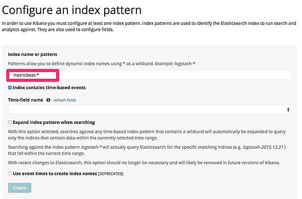 ここではMetricbeatのindexをKibanaと紐づけてみます。まず始めに、「Index name or pattern」の部分に「metricbeat-*」と記入しましょう。「*」は正規表現なので、「metricbeatで始まるindex名を全て選択する」という意味となります。