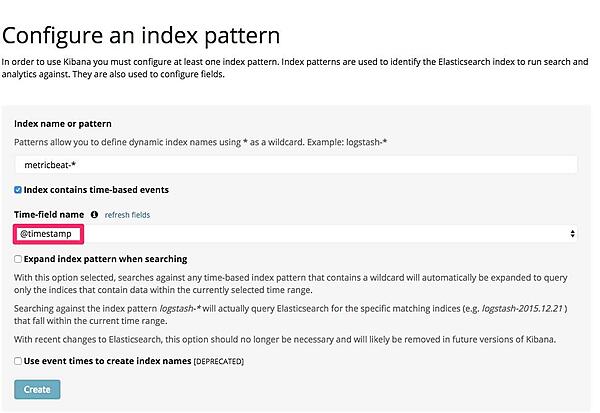 次に、「Time-field name」に「@timestamp」と入力します。index内のデータに時間情報が含まれている場合、「Index contains time-based events」にチェックをつけるのですが、その場合どのfield内の情報を時間として利用するか決定しなくてはいけません。