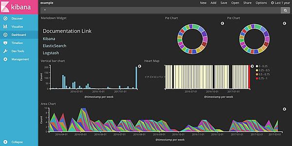 Visualizeで作成したグラフを一箇所にまとめて参照できます。各グラフの配置・大きさは自由に決定することができます。Googleで「Kibana」を画像検索するとDashboardの画面が多く表示されます。やはりグラフが集まっていると見栄えも良いですよね。