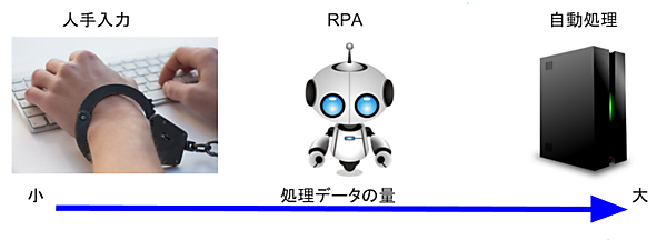 RPAは、コンピュータによる自動処理と手入力の中間に位置します。普通に考えれば、前述の例に掲げたExcelデータの入力作業が日常的に発生するなら、データ取り込みプログラムを作って自動処理した方が手っ取り早いといえます。しかし、現実的にはシステム部門のバックログは積み上がっており、システム化が間に合っていない業務は社内にごろごろしています。