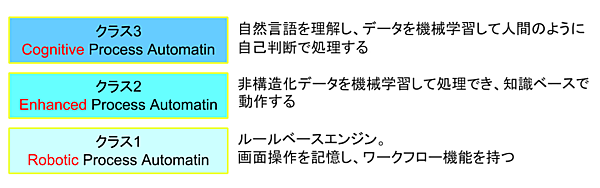 冒頭でRPAは”機械学習モノ”ではなく”ロジックモノ”だと書きましたが、RPAにAI要素を取り入れてより賢いRPAを目指す取り組みがなされています。そうした観点からRPAは3つのクラスに分けられています(図4)。
