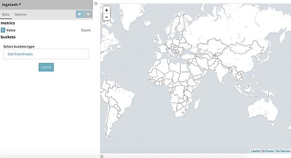 データの送信元情報がログなどに含まれていた場合、その情報がどこから来たのか世界地図にプロットすることが可能です。この世界地図の情報ですが、世界地図のマップ情報はElastic社のサーバから取得しているためインターネット環境がないと何もすることができません。ちなみにKibana3、4などについては使われていた世界地図情報の取得元サイトがサービスを終了してしまったため、Tile mapの使用は不可能となってしまいました。