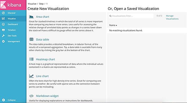 Visualizeボタンをクリックすると、すぐにグラフの種類を選択する画面が現れます。新規にグラフを作成する場合、「Create New Visualization」の中から好みのグラフを選びクリックします。後の手順は5.4より後の場合と同じです。