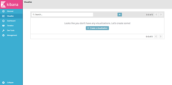 グラフを初めて作成する場合は何も表示されませんので、「Create a visualization」をクリックするか、青い「+」ボタンをクリックしましょう。
