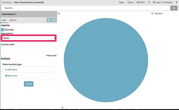 クリックすると、Aggregationという文字と空欄が表示されます。空欄をクリックすると、複数選択肢が表示されます。ここから円グラフを分割するためのデータは何を指定するか、を選択していきます。今回はOS上で動いていたプロセス名の内訳を表示する円グラフを作成するため、該当のデータが入っている「system.process.name」fieldの値を利用して分割する設定を行います。