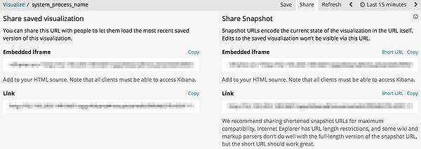 Shareをクリックすると、グラフのURLが表示されます。左の「Share saved visualization」のリンクを共有すると、他の人にKibana画面のURLリンクを共有することができます。HTMLにURLリンクを挿入したい場合はEmbedded iframe欄に記載されているリンクをコピーします。URLリンクとして共有したい場合、Linkを選択します。