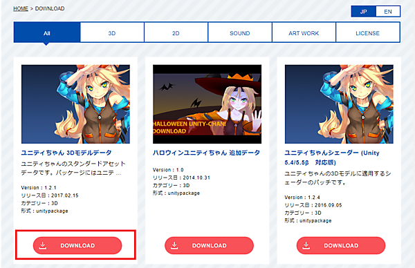 ライセンスに同意してダウンロードページへ進むと、ユニティちゃんに関する様々なデータがダウンロードできるようになっています。シェーダーやコスチューム変更用モデル、デフォルメモデルなどもありますが、今回はベースとなる「ユニティちゃん 3Dモデルデータ」をダウンロードしましょう(図3)。