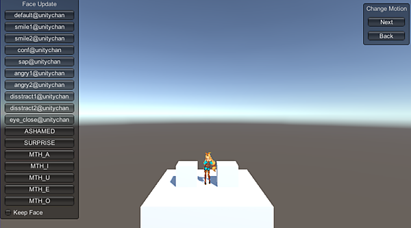 ここまで出来たら「プレイ」ボタンを押してみましょう。すると、画面左と右上に何やら見慣れない表示が出てきます(図7)。これはユニティちゃんのPrefabに標準で付いているスクリプトで、右上にある「Change Motion」の「Next」「Back」をクリックすることでユニティちゃんのモーションを切り替えて確認することができます。