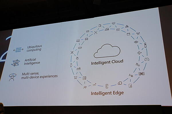 また、パラダイムとして、Microsoftが近年繰り返している「Intelligent Cloud」と「Intelligent Edge」の有機的な結びつきを挙げた。そして、そのコアとなるテクノロジーとして、「Ubiquitous computing(ユビキタスコンピューティング)」「Artificial Intelligence(AI)」「Multi-sense, multi-device experiences(デバイスをまたがったエクスペリエンス)」の3つを挙げた。