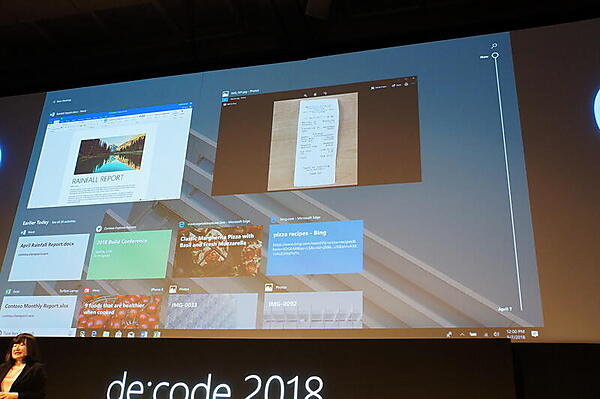 1つめは、Windows 10 April 2018 Updateで実装された「タイムライン」の機能だ。過去に使ったアプリケーションやウィンドウ構成などのアクティビティを最大30日さかのぼれる。タイムラインはAndroidではMicrosoft Launcher、iOSではMicrosoft Edgeによってスマートフォンでも使え、PCと同じものが見える。「オペレーティングシステムを再定義したいと思っている。Windowsデバイスだけを朝から晩まで使っている人は稀だ」(伊藤氏)。