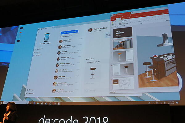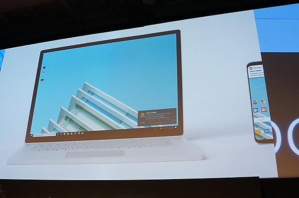 2つめは、次のWindows 10メジャーアップデートで予定されている「Your Phone」だ。スマートフォンの機能をそのままWindows上で利用できる(UWPアプリ)。伊藤氏は、スマートフォンに来たメッセージの通知がPCにも表示されるだけでなく、それにPC上で返信したり、デスクトップに保存した画像をシームレスにスマートフォンのアプリに送るところや、スマートフォンアプリの添付ファイルをPCに保存するところを紹介した。また応用例として、経費精算のときに、スマートフォンでレシートを写真に撮ってPCでメモを書き込み、これをスマートフォンの経費精算アプリに送るところを見せた。