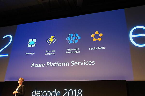 1つめは「コンテナ+サーバレス」だ。コンテナやサーバレス(FaaS)のプラットフォームは各クラウド事業者から提供されているが、「Azureがすごいのは、各機能について最適化されたすばらしい環境を提供する点だ」とWhite氏は主張。PaaSのWeb Apps、FaaSのFunctions、CaaSのAKS、マイクロサービスプラットフォームのService Fabricを紹介した。