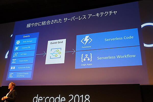 サーバレスのメリットとしてはコードがイベントドリブンで動き、スケーラビリティがよくなることや、必要なときだけリソースが使われることをWhite氏は説明した。その中で「Azure Functions」の特徴として、いろいろな言語が使えることや、いろいろなAzureサービスと簡単に接続できるワークフロー機能「Azure Logic Apps」を挙げた。