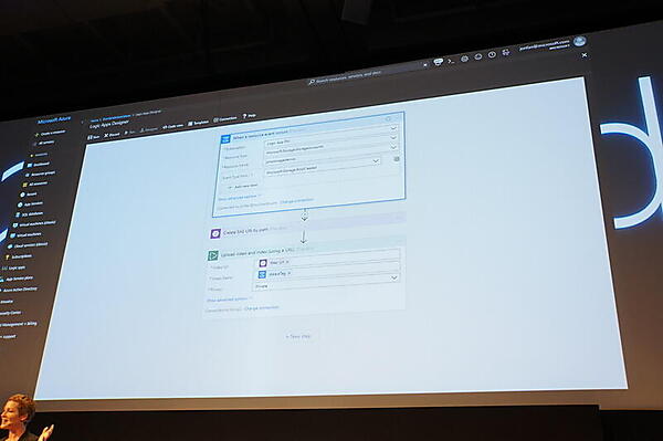 さらに、Azureの新しい機能として「Azure Event Grid」が紹介された。イベントをハンドラーに簡単につなぐためのルーティングサービスで、1秒あたり100万イベントを処理できるという。White氏は、AzureポータルからEvent Gridを使ってワークフローを作成する例を紹介し、「コードを書かずにサーバレスのロジックを定義できる」と説明した。
