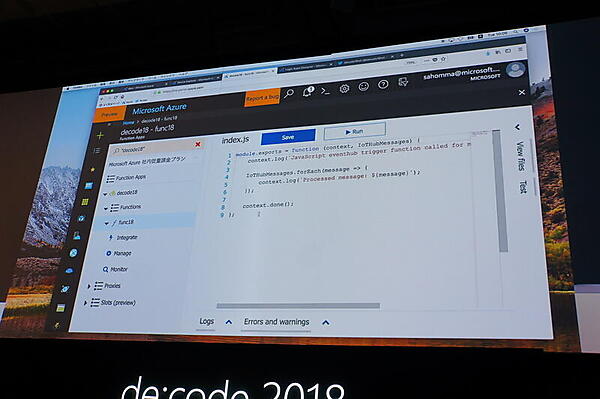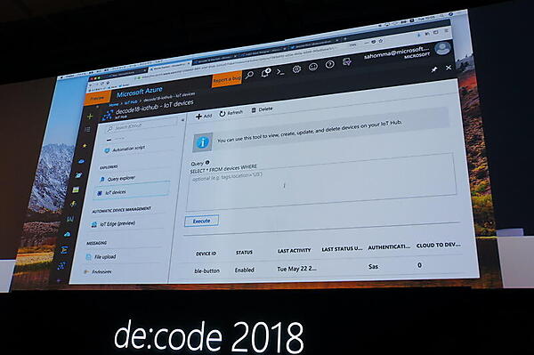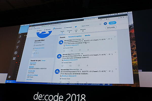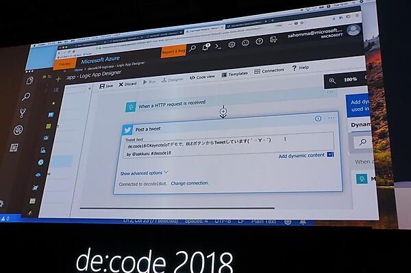 ステージではサーバレスとIoTを組み合わせるサンプルとして、実際に本間咲来氏がデモした。BLE接続のボタンを押すとTwitterにツイートするシステムを数分で作るというものだ。まずIoT HubのWeb画面でのイベント定義と、JSONを返す簡単なFunctionsのコードを用意する。そしてワークフローを定義するLogic AppsでTwitter投稿のアクションを作成するとその場で完成して、実際にTwitterのタイムラインにメッセージが流れた。