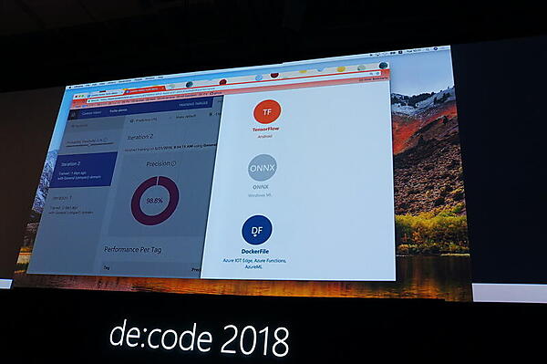 Azureの一部機能をIoTのエッジ側で実行する「Azure IoT Edge」も紹介された。Azure Machine LearningやAzure Functionsなどの機能を、エッジ側のWindowやLinuxの上で動作させることができる。