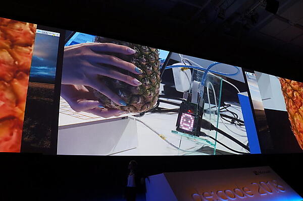 IoT Edgeについても本間咲来氏がデモした。Raspberry Piでリアルタイムに画像認識するもので、Azureコグニティブサービスで学習したモデルをIoT Edgeにダウンロードすることで、Raspberry Piにパイナップルをかざすと、LEDの絵がパイナップルになった。