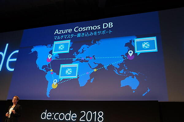 Cosmos DBの特徴としては、世界中に分散されてどのロケーションでも高速に利用できることや、複数のリージョンを組み合わせることでゼロダウンタイムを実現すること、柔軟なスケール、さまざまなプログラミングモデルによる柔軟な再利用性、マルチマスター書き込み対応などが紹介された。