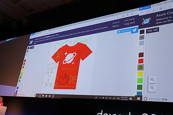 実際にCosmos DBを使ったアプリケーションのデモが、Lara Rubbelke氏と千代田まどか(ちょまど)氏によりなされた。Rubbelke氏がAzureの日本のリージョンに、千代田氏がアメリカのリージョンにアクセスして、Tシャツの絵柄に手書きでコメントを書き込む例だ。このサンプルのデータは20のリージョンに分散し、世界中で同時にリード/ライトができる。