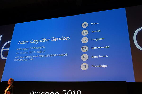 「AI」については、Microsoftが音声認識や画像認識などで数々の成果を上げていることや、それをサービスとして提供し開発者でなくても利用できることを説明した。