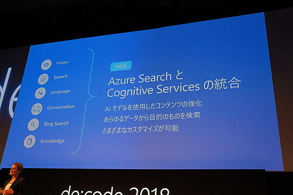 そして新機能として、クラウド検索サービスの「Azure Search」とCognitive Servicesの統合も紹介された。ビデオの内容のインデックス作成や、ビデオのテキスト起こしなどに対応する。