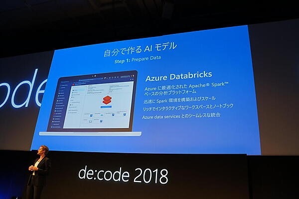 まず、80%の力を使うともいわれるデータの用意。Azureに最適化されたApache Sparkベースの分析プラットフォーム「Azure Databricks」が紹介された。