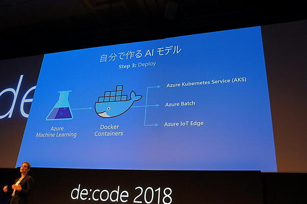 作ったモデルを使うためのデプロイについては、Azure Machine Learningで作ったモデルをDockerコンテナにして、AKSやAzure Batch、Azure IoT Edge、あるいはオンプレミスで使う方法が紹介された。