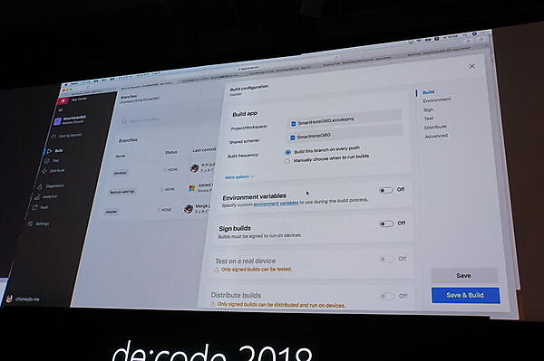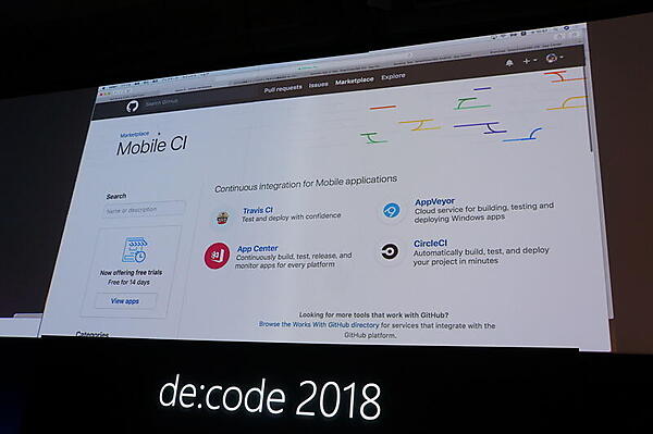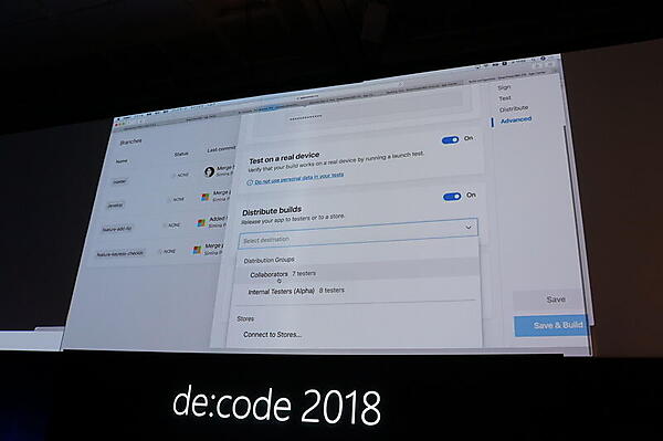 そのうえで、新しいサービスとして、Visual Studio App CenterとGitHubの組み合わせが紹介された。Visual Studio App Centerは、iOSとAndroidの開発のためのサービスで、ビルドやテスト、テストユーザーへの配布、クラッシュレポートなどの機能を持っている。