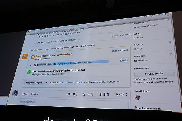 題材は、iOSのホテル業務アプリ。このアプリのGitHubリポジトリにプルリクエストが来ているところからデモが始まった。「ここで何も考えずにマージボタンを押す人はいないので、まず自分の環境で動かすが、毎回は面倒」(千代田氏)。