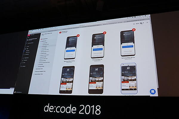 ビルドされたアプリは、Visual Studio App Centerから実機テストを自動で走らせることもできる。異なる機種、異なるOSバージョン、異なる言語のほか、Androidも含めて一度に100種類以上の実機でテストできるという。テストに失敗した機種についてはログを見られる。