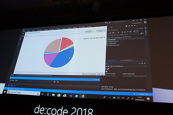 .NET Coreについて、原綾香氏が再び登場してデモした。パイチャートを表示する同じサンプルコードを、.NET Frameworkと.NET Coreのそれぞれのプロジェクトにし、両者が同じように動くことを見せた。さらに、.NET Core版が処理速度が速かったことや、約66MBのEXEファイルにまとめられたところも示した。