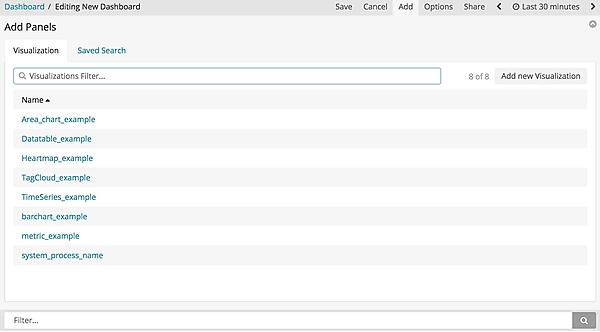 ボタンをクリックした後、「Add」と書かれているボタンをクリックします。Visualize画面で作成・保存したグラフのリストが表示されますので、Dashboardに並べたいグラフを選択してクリックします。「Saved Search」から保存済みの検索条件を選択すると、ログの詳細が表示されます。