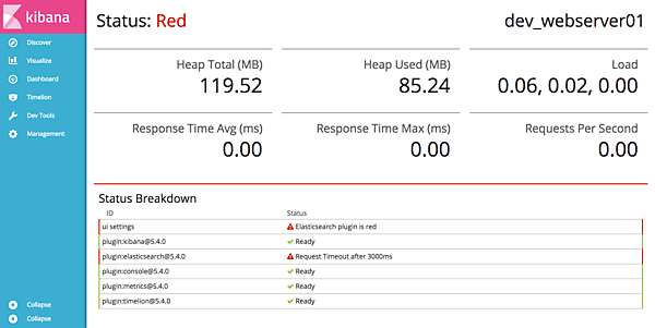 このような場合、Elasticsearchが起動しているか・ネットワーク的に問題がないかを確認してください。Kibanaの画面が見えていますので、Kibana側の問題ではありません。