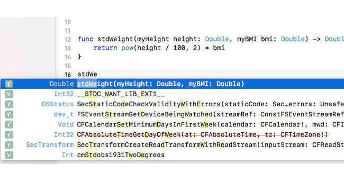 上記のように定義しておくと、Xcodeのエディタを使用して関数呼び出しのコードを入力するときに、関数名の最初の数文字をタイプした時点で関数のヒントがラベル付きで表示されます。
