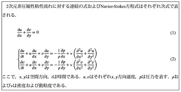 理工系の文章としては一般的な体裁をした例文である.まず何の式であるかについて言及し,独立した2行にそれぞれ連続の式とNavier-Stokes方程式を記述し,その後,式の各変数が意味する物理量を説明している.我が国の文法では,文法的段落を変える際は字下げ3を行うので,我々は字下げの有無によって文法的段落を見分ける.すなわち,例文全てが一つの文法的段落であると容易に認識できる.