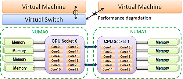 例えば、使用するハードウェアが複数のCPUとメモリを一つのシステムに乗せたNUMA(Non-Unified Memory Access)アーキテクチャとなっている場合、仮想マシンが動作するCPUソケットと、仮想スイッチなどのネットワークバックエンドの動作するCPUソケットが別であると、同じソケット上に片寄せした場合と比べて性能が下がってしまいます。これはCPUコアがメインメモリにアクセスする際、遠いメモリの方が近いメモリよりアクセスコストが高いことが原因です。