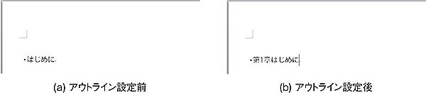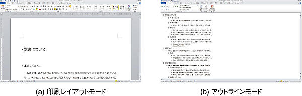 Wordを立ち上げると,図 20(a)に示す,あたかも紙に文字を書いていくかのような画面が現れる1.この表示モードを印刷レイアウトモードという.何らかの長い文書を作成する際に,最初から順序よく書き出して,最後まで一気に書き切る人はそうそういないだろう.書きたい,あるいは書くべき項目を考えて見出しとして書き下し,各見出しの本文を徐々に増やしていくのではないだろうか.そのような書き方をする場合は,図 20(b)のアウトラインモードが非常に有用である.