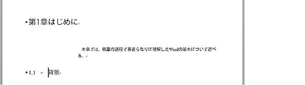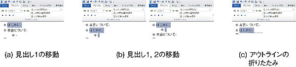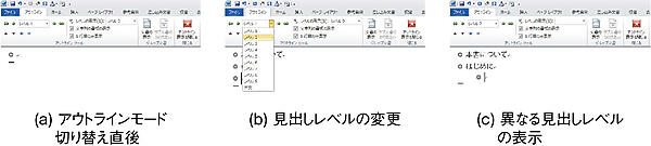 アウトラインモードに切り替えるには,表示タブからアウトラインを選択するか,ショートカットキーAlt+Ctrl+Oを利用する.アウトラインモードに切り替えると,見出し1を記述する状態になる.これはアウトラインモードへの切り替えに伴って現れるアウトラインタブのアウトラインツールで確認できる.見出し1の項目を書いてエンターキーを押すと,次の見出し1の項目が書けるようになる.このまま見出しを書き続けて擬似的な目次を作成してもよいし,見出し1を記入する状態でTabを入力すれば,見出しのレベルが一つ下がる(章から節にかわる).ショートカットキー(Alt + Shift + →)も利用できる.レベルは9まで用意されており,レベルを上げるには,Shift + TabもしくはAlt + Shift + ←を利用する.見出し以外には本文というレベルがあり,見出し以外(本文,リード文やAbstract,図表等)は本文レベルにする.2
