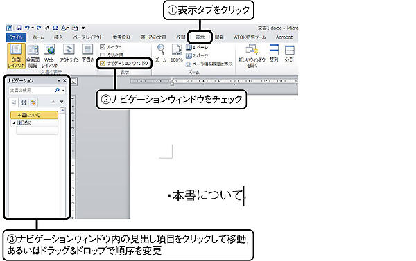 アウトラインモードで見出しを作成しておけば,印刷レイアウトモードでも同様の事が可能である.印刷レイアウトモードでの作業中に,表示タブからナビゲーションウィンドウにチェックを入れると,見出しの項目が一覧で表示される.そこから各見出しへ移動できるし,ドラッグ&ドロップで見出しの位置を文書の前後に移動させることもできる.