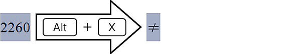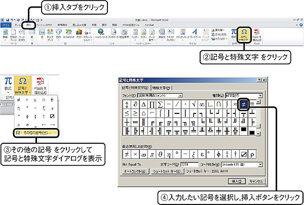 記号と特殊文字ボタンをクリックすると,利用した記号の履歴が20件分表示されるので,その中に入力したい記号があれば,それを選択する.その他の記号を選択すると,記号と特殊文字ダイアログが表示される.ショートカットキーによる入力も一応可能である.記号と特殊文字ダイアログから所望の記号を探すと,その文字に割り当てられた文字コードが書かれている.その文字コードをWordの本文中に入力して選択し,Alt+Xを押すと記号に変換される.たとえば,Not Equal To記号を入力するには,2260を入力して選択状態にし,Alt+xを押す.使用頻度の高い記号についてはショートカットキーを用いた入力方法が異なる場合もある.文字コードも簡単ではないので,よく利用する記号は履歴に残した方が効率的だと思われる.