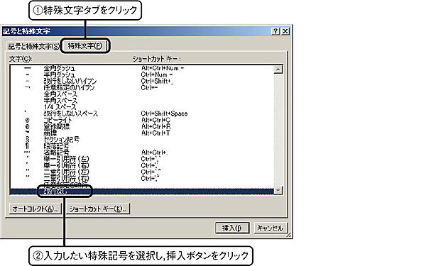 記号と特殊文字ダイアログから,いくつかの制御文字を入力できる.技術文書では,改行なしの使用頻度が高いと思われる.文献を引用する際,引用箇所に文献番号を記載する引用スタイルを採用していると,文献番号で次の行に送られてしまうことが多々ある.下記例文のように文献番号を上付き添え字で引用している場合,引用文献番号が文頭に送られると非常に不格好である.本文と引用文献番号の間に改行なしを入力しておくと,その箇所では行が送られず,前の文字と結合されたかのような状態で次の行に送られる.