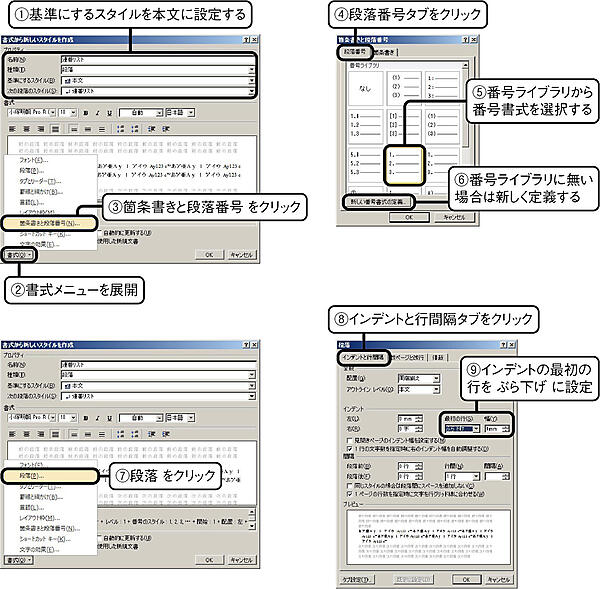 Wordで連番や箇条書きを正しく取り扱うには,ホームタブの箇条書きあるいは段落番号を利用するのではなく,新しくスタイルを作成する.新しくといっても,既に説明しているように,既存のスタイルを基に箇条書きと段落番号の設定を行うだけである.なお,箇条書きというスタイルは既に存在しているので,既存スタイルの変更手順は4.5節を参照にされたい.