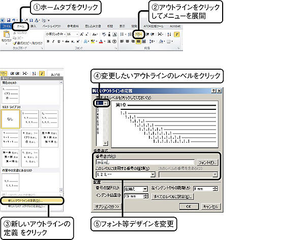 デザインに関することは全てスタイルで行ってきたが,見出し1レベルのスタイルや見出し2レベルのスタイルに番号を付与する設定は,スタイルからではなくホームタブのアウトラインから設定する.おそらく,見出し全て(レベル1から9)に関係するためであろう.ホームタブのアウトラインをクリックするとメニューが展開される.リストライブラリに所望のデザインがあればそれをクリックするだけで,章番号,節番号などが付与される.もっとデザインに凝りたいという場合には,新しいアウトラインの定義をクリックし,新しいアウトライン定義ダイアログを開き,所望のデザインになるように設定する.なお,見出しのレベルは1から9まで存在しているが,必要なレベルだけを設定すればよい.