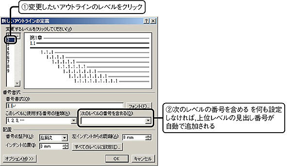 見出しレベル2以降の番号書式を編集する際, “章番号.節番号”のように,上位レベルの番号も含めたい場合には,次のレベルの番号を含める の項目を設定する.当該項目に何も表示されていなければ,全ての番号が番号書式に含まれる.