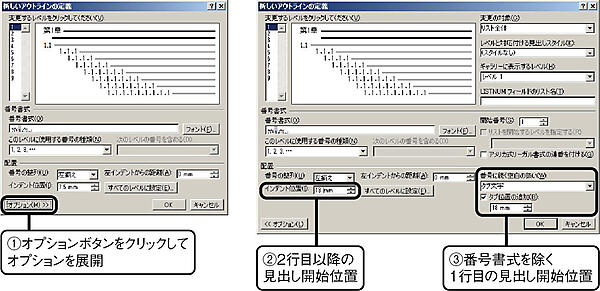 インデントの調整には,新しいアウトラインの定義ダイアログのオプションから設定する.オプションボタンをクリックすると,ダイアログの右にオプションが展開される.インデント位置を調整すると,2行目以降の行頭の位置が定められる.次に番号に続く空白の扱いをタブにし,タブ位置の追加をチェックし,先ほど設定したインデント位置と同じ数値に設定する.
