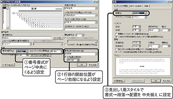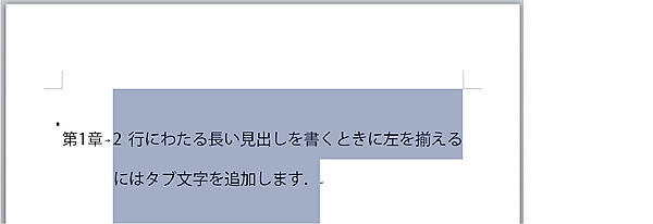筆者の執筆環境では,見出しとして,1行目に章番号,2行目以降に見出しを中央揃えで書くようにデザインしている.残念ながら行を送る正しいやり方が分からず,設定は試行錯誤的である.まず左インデントが本書のページ中央に来るように,ページサイズと余白の数値から執筆領域の幅を計算して左インデントからの距離を設定し,番号の整理を中央揃えにする.その後,番号に続く空白の扱いをタブ文字とし,ページ右端に来るようにタブを追加する.見出し1のスタイルにおいて,配置を中央揃えに設定する.このように設定すると,章番号がページ中央に置かれ,章の題目はページの右端にはみ出して表示される.題目の前に半角スペースを入力すると,番号および章題目が見事に中央揃えになる.Shift+Enterで段落内改行を挿入してもよいが,その場合は第11章で紹介するヘッダーの設定が難しくなる.